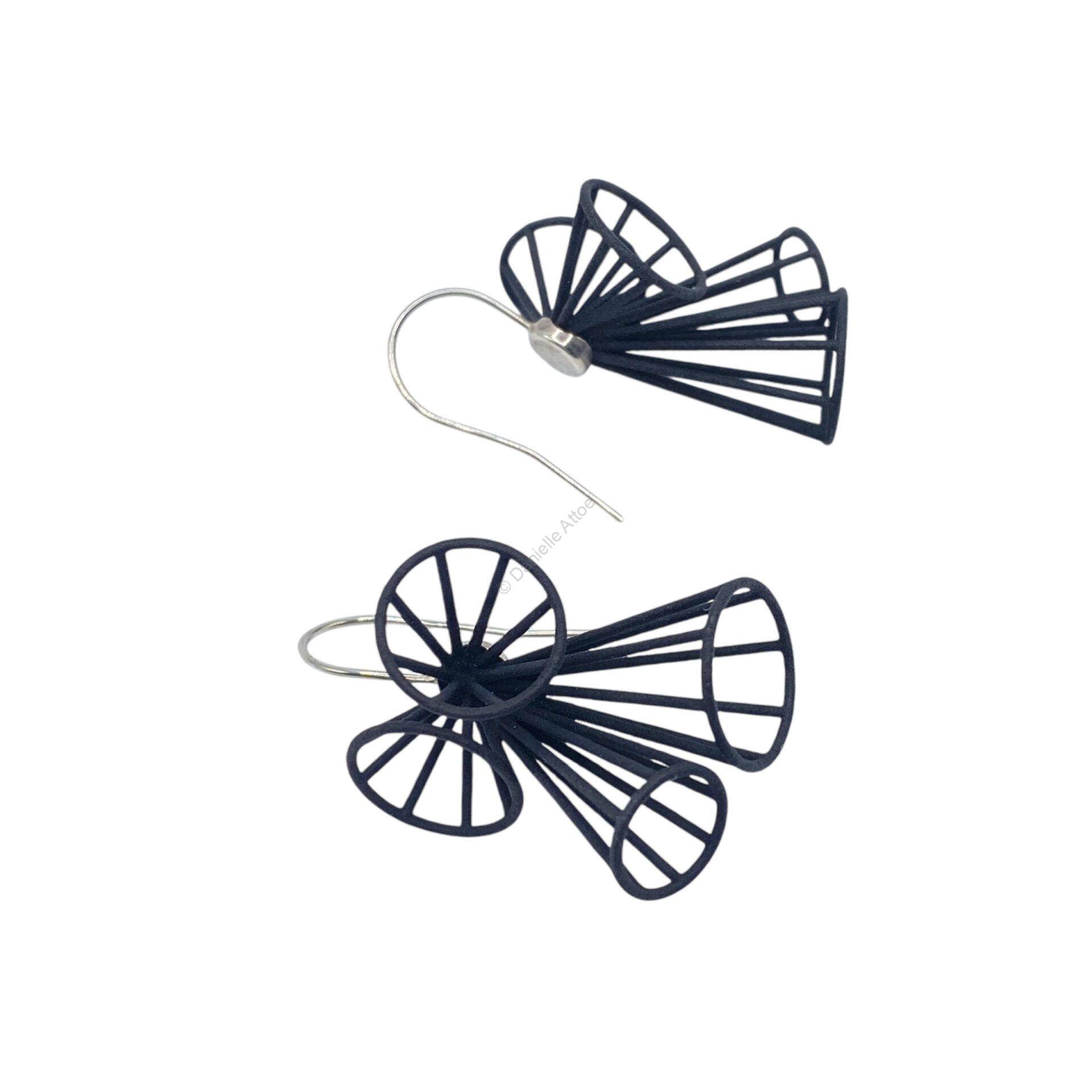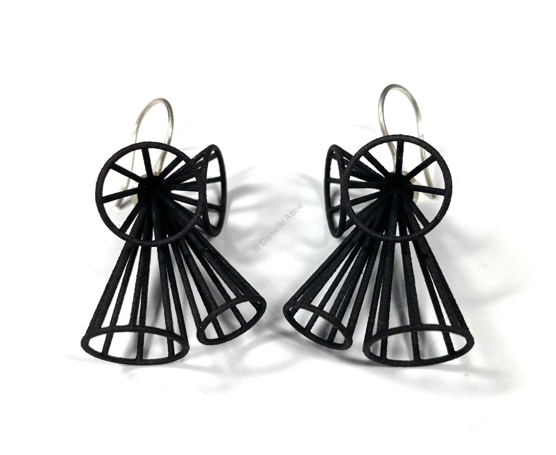 Designed by Rachel, these earrings are specialty 3D printed nylon forms with sterling silver bezels and hooks. The unique material is lighweight and slightly flexible. They’re sure to make a statement at any occasion!