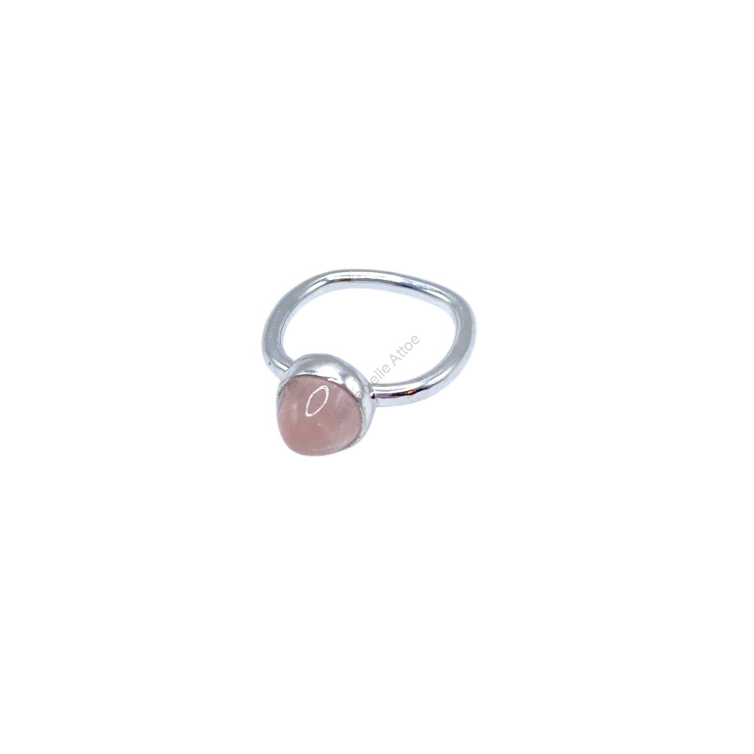 This Argentium silver ring features a square, hammered silver and with a bezel set rose quartz cabochon. Size 5.5