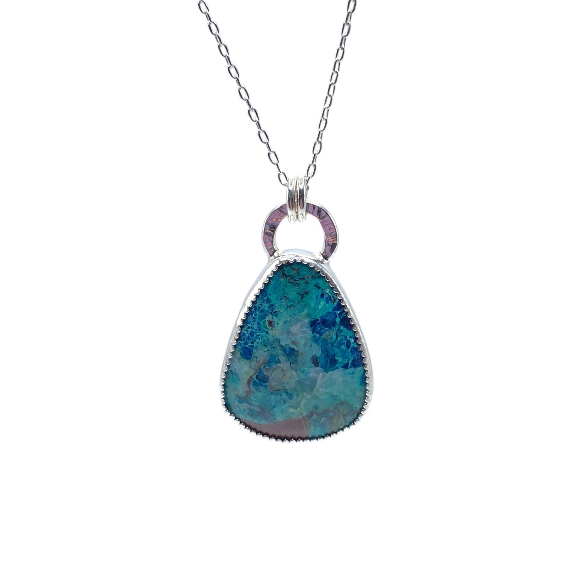 This gorgeous blue green stone sits securely held in a decorative bezel and is hung on a 20″ chain.